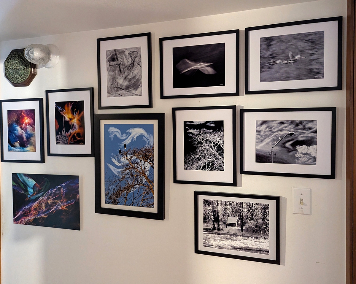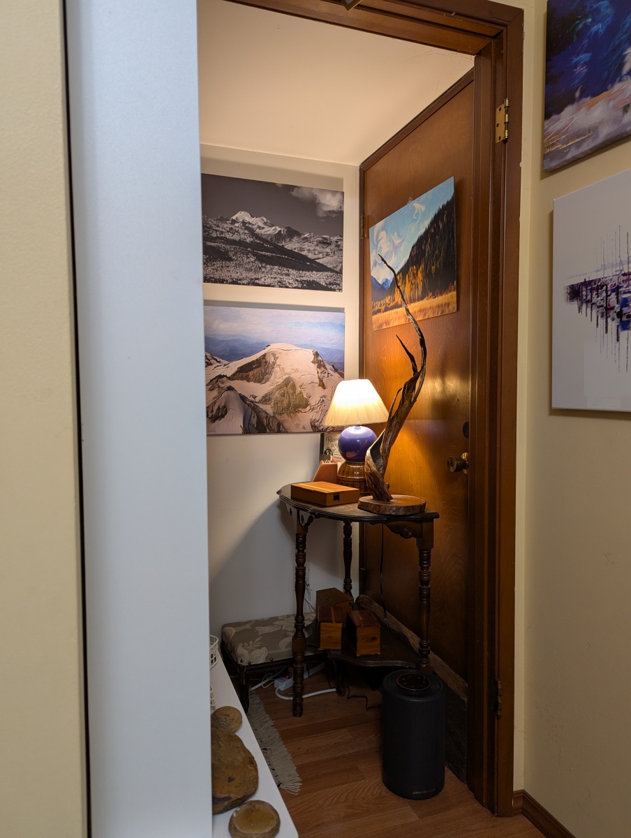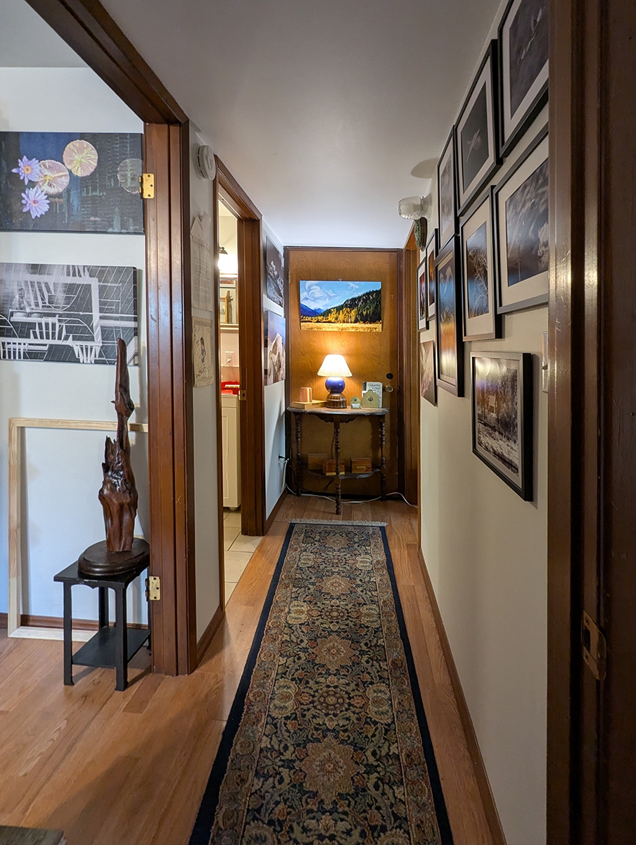 Here we have the hallway mainly covered with my art. Art is also found in the bedroom and bathroom. I do the best I can with the space I have. I am always working to improve it.