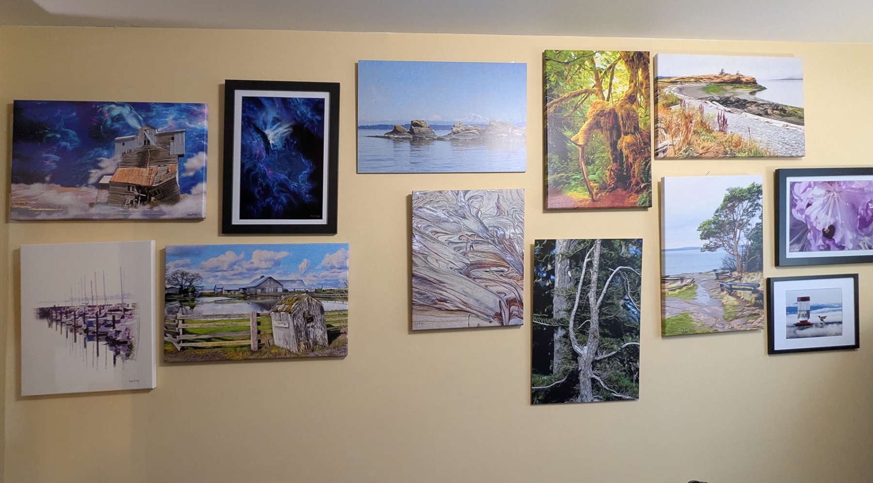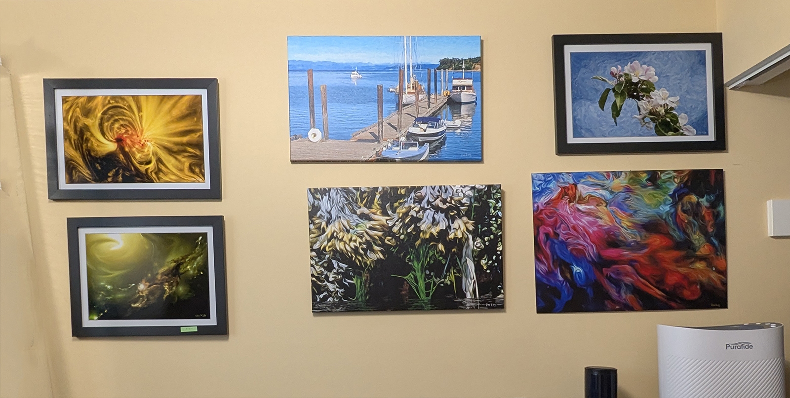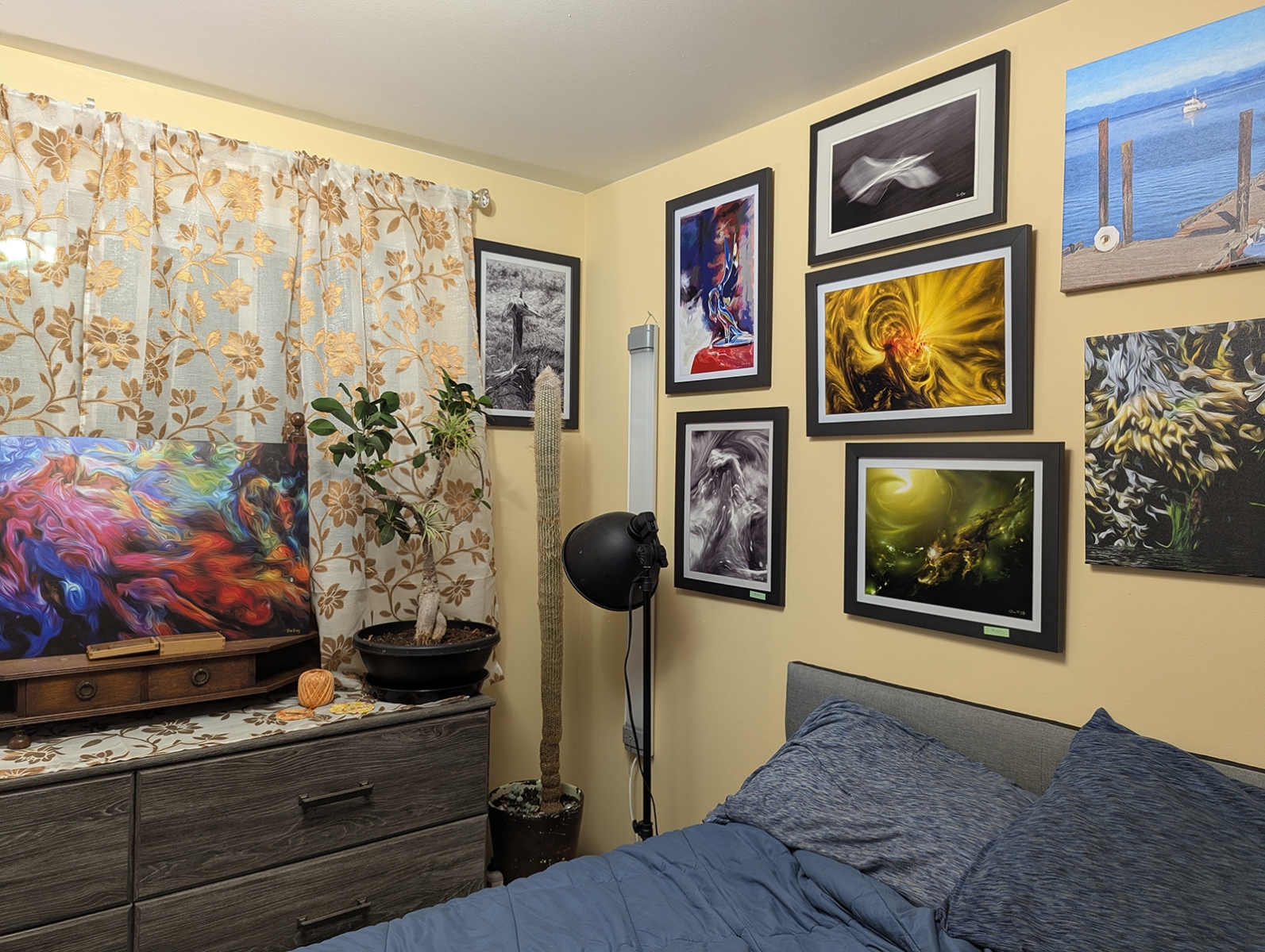 Here we have the hallway mainly covered with my art. Art is also found in the bedroom and bathroom. I do the best I can with the space I have. I am always working to improve it.