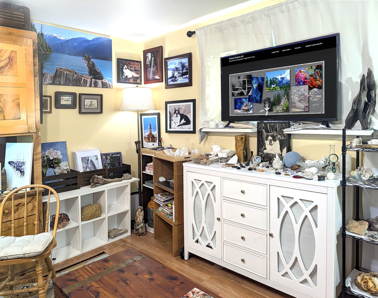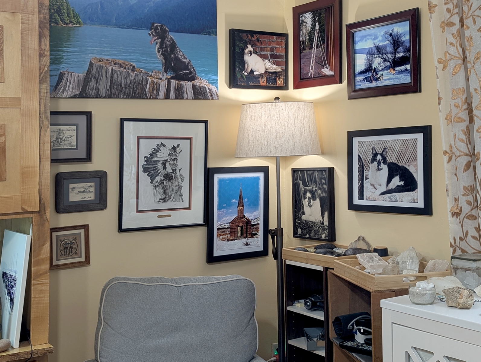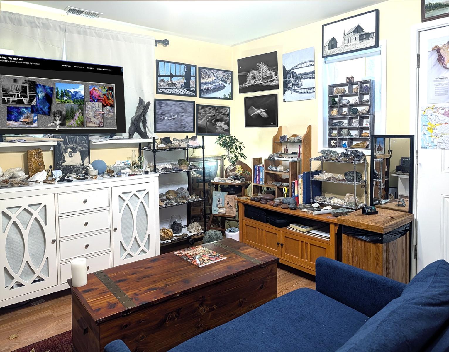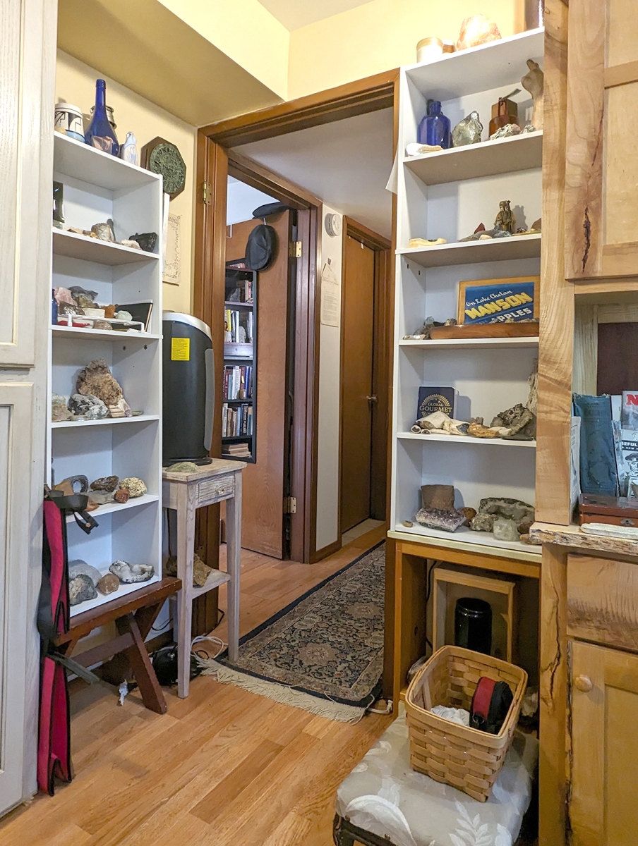 This is the main room as you enter. The walls showcase some of my favorite pets from my past, some Native American (mostly American Indian, but some relating to Eskimos and Aleuts) art, artifacts, and books. Rocks and treasures from my travels and past are everywhere.