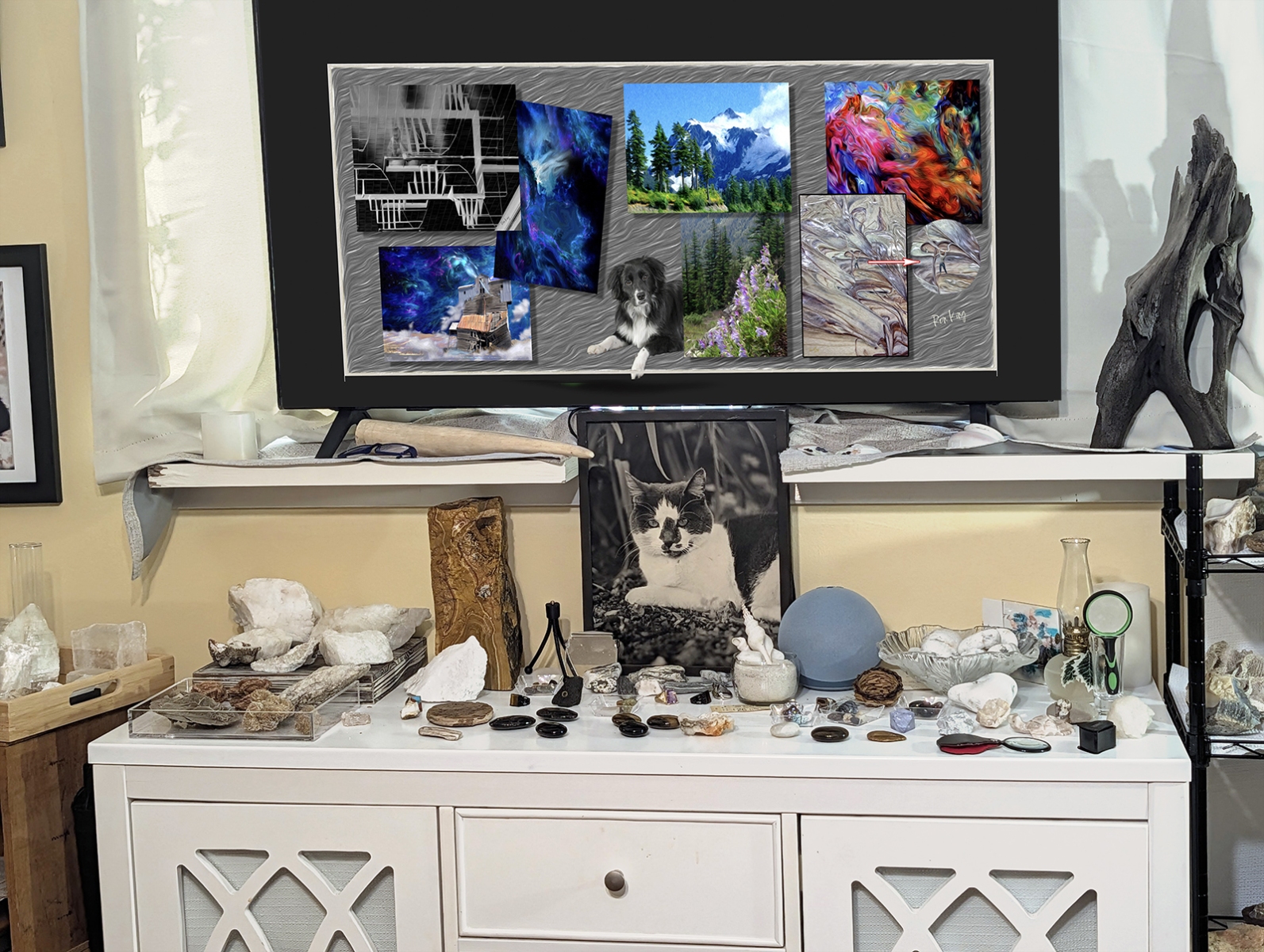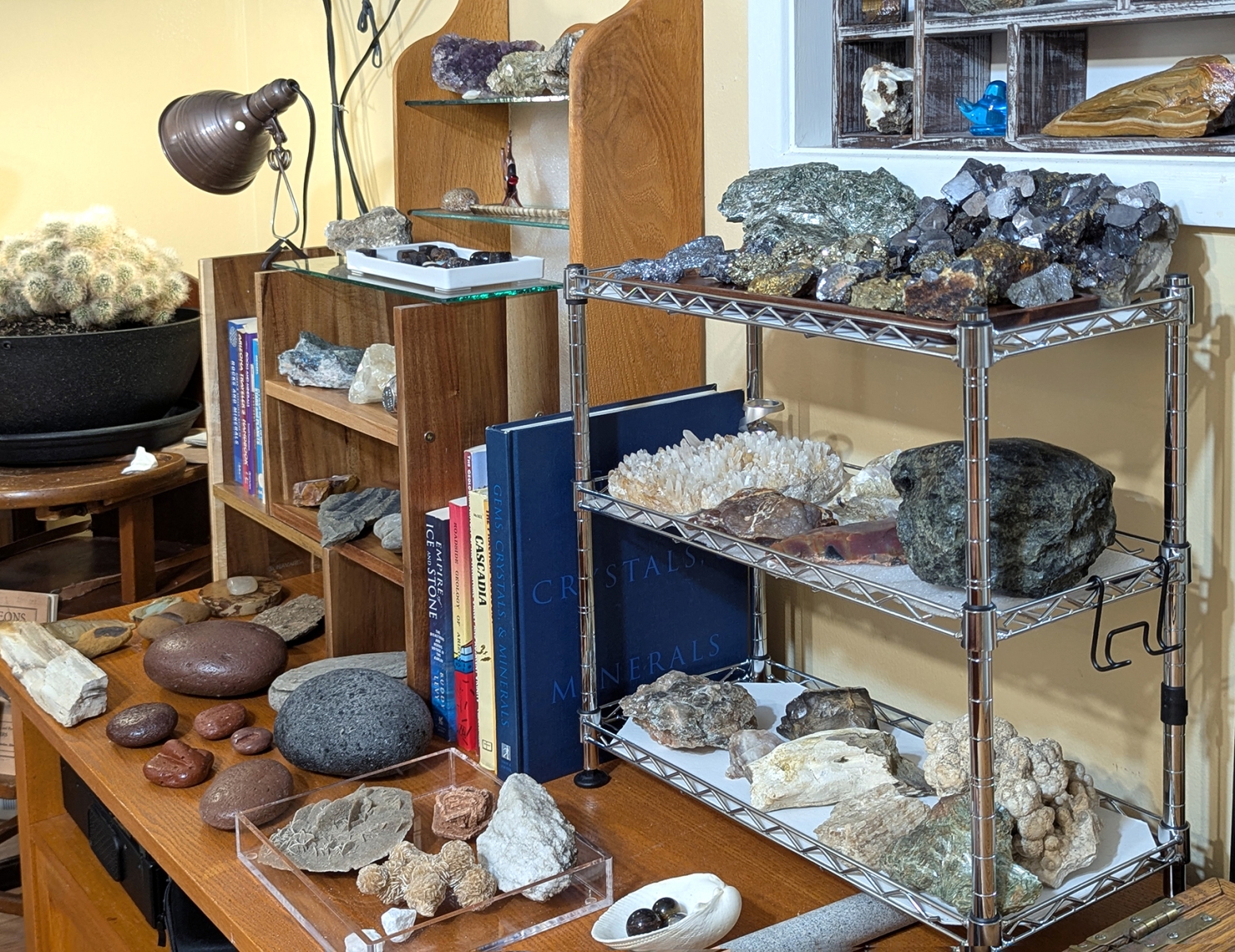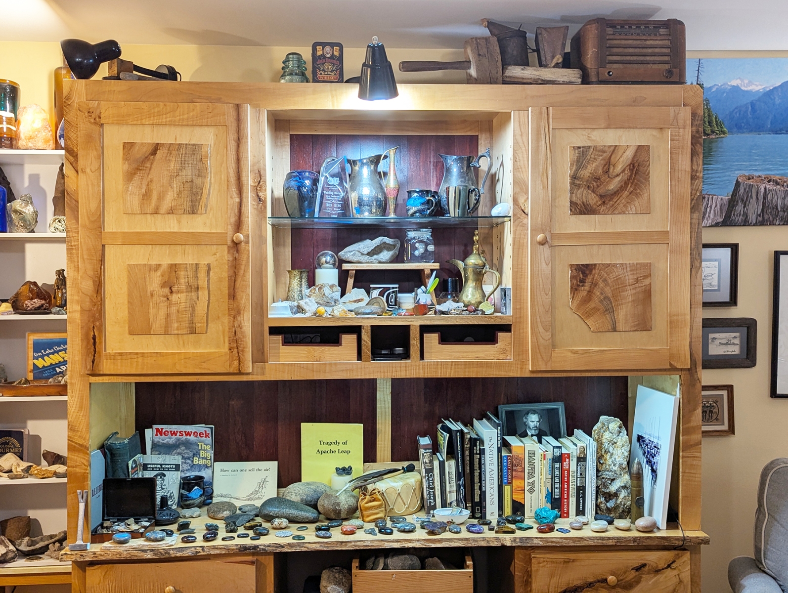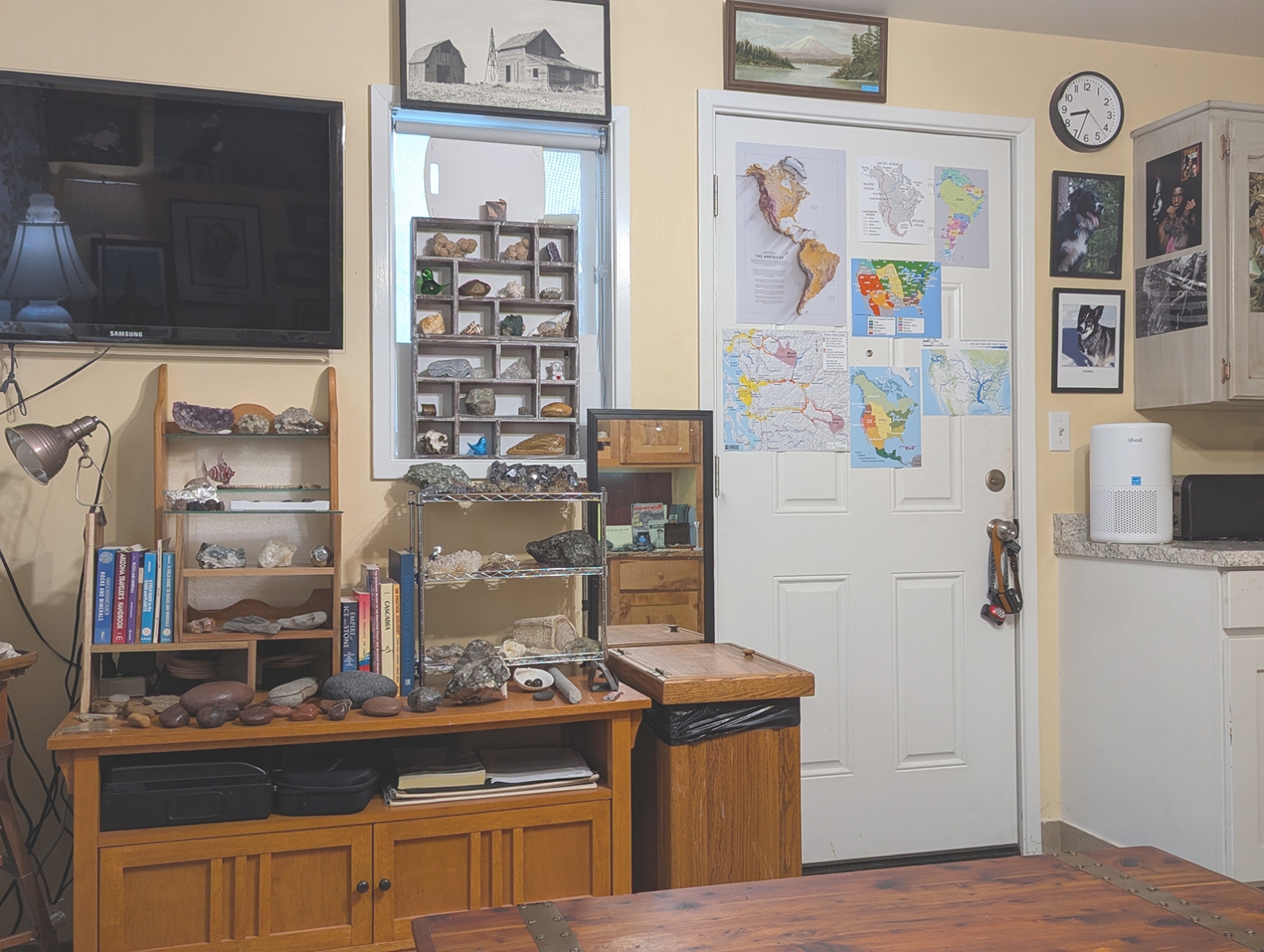 This is the main room as you enter. The walls showcase some of my favorite pets from my past, some Native American (mostly American Indian, but some relating to Eskimos and Aleuts) art, artifacts, and books. Rocks and treasures from my travels and past are everywhere.