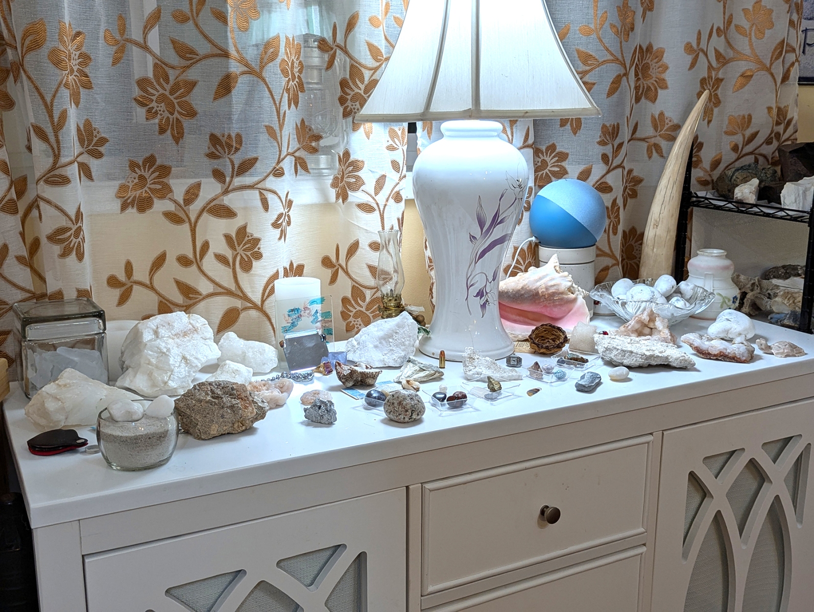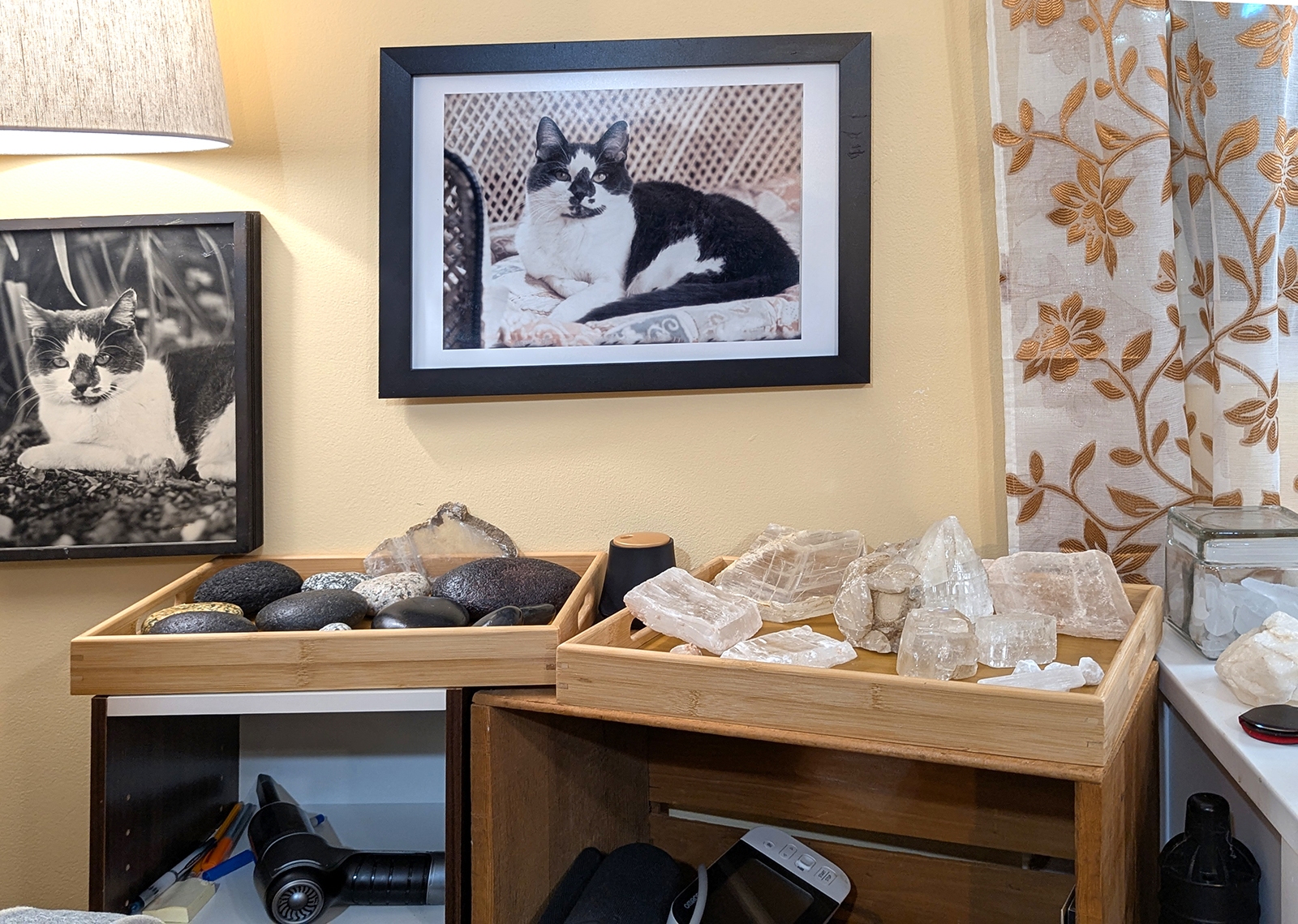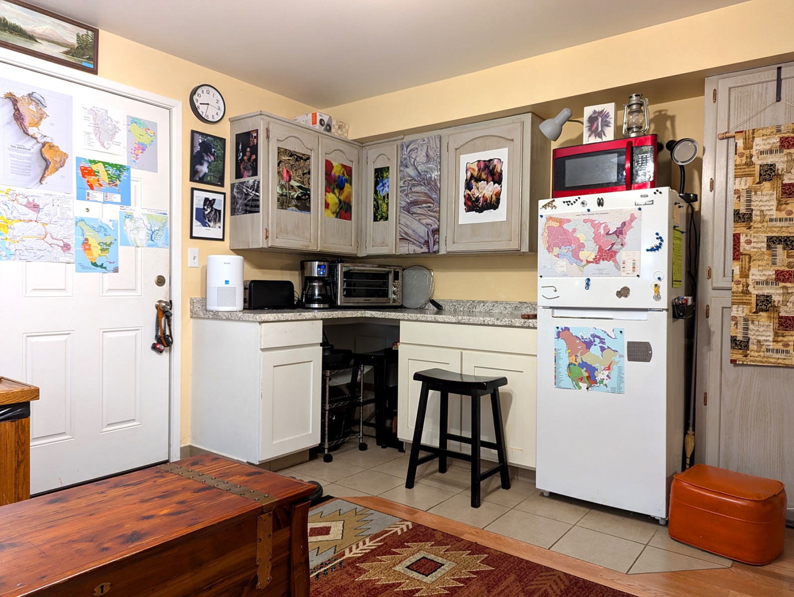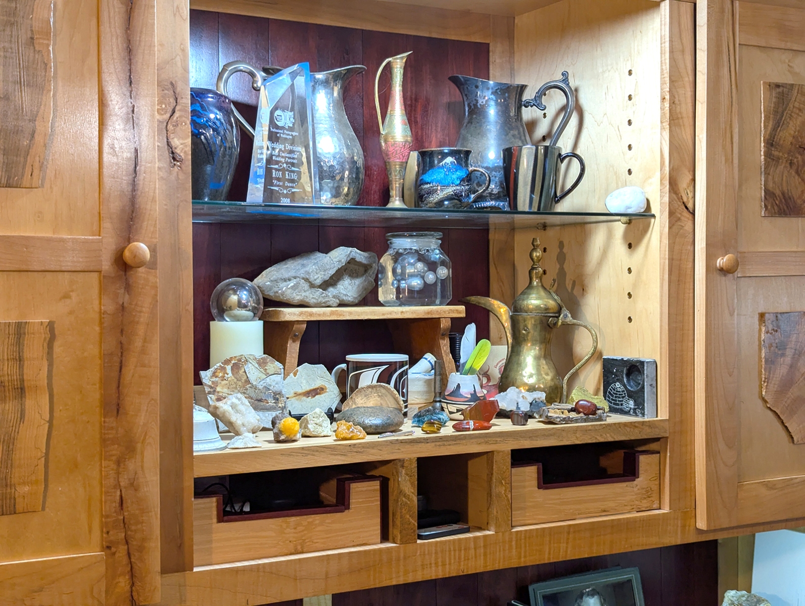 This is the main room as you enter. The walls showcase some of my favorite pets from my past, some Native American (mostly American Indian, but some relating to Eskimos and Aleuts) art, artifacts, and books. Rocks and treasures from my travels and past are everywhere.