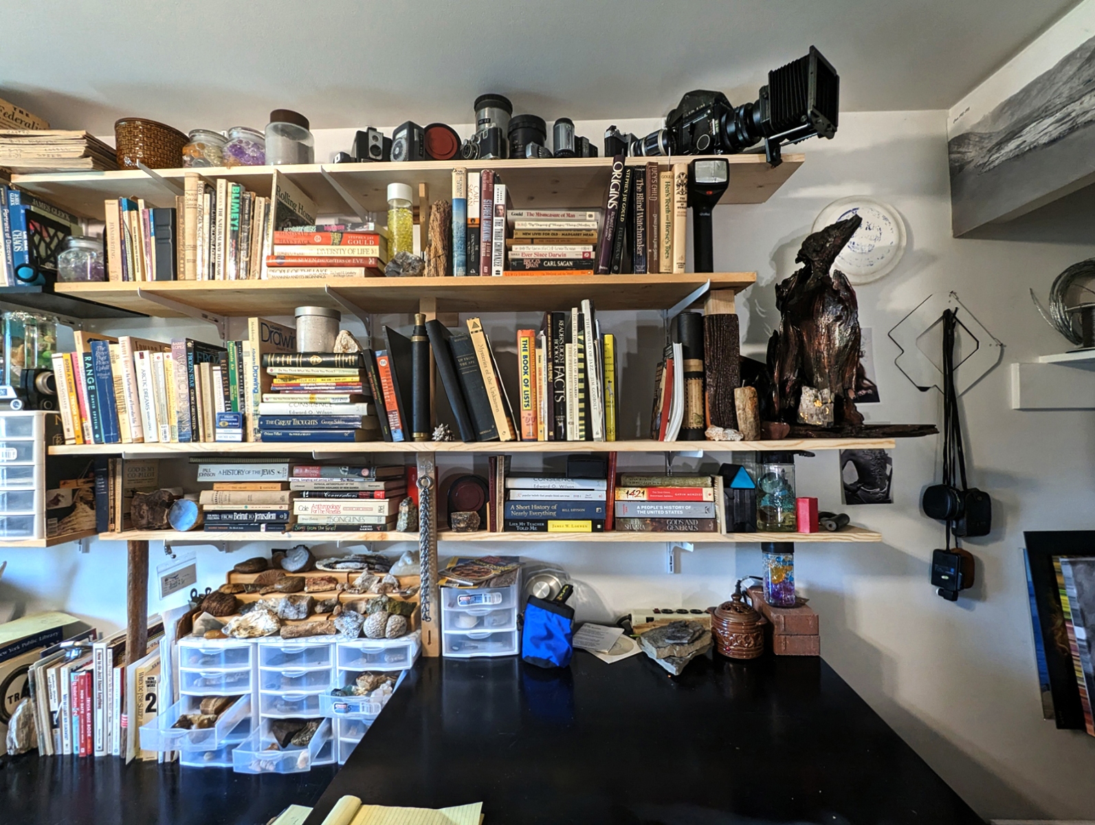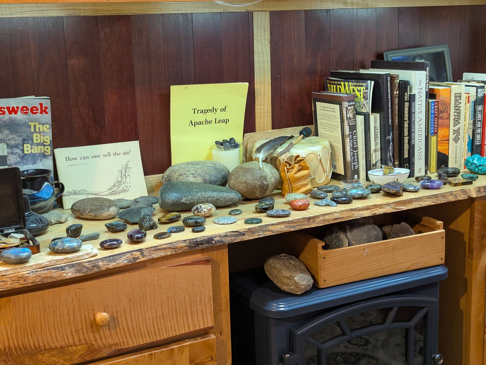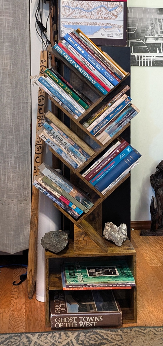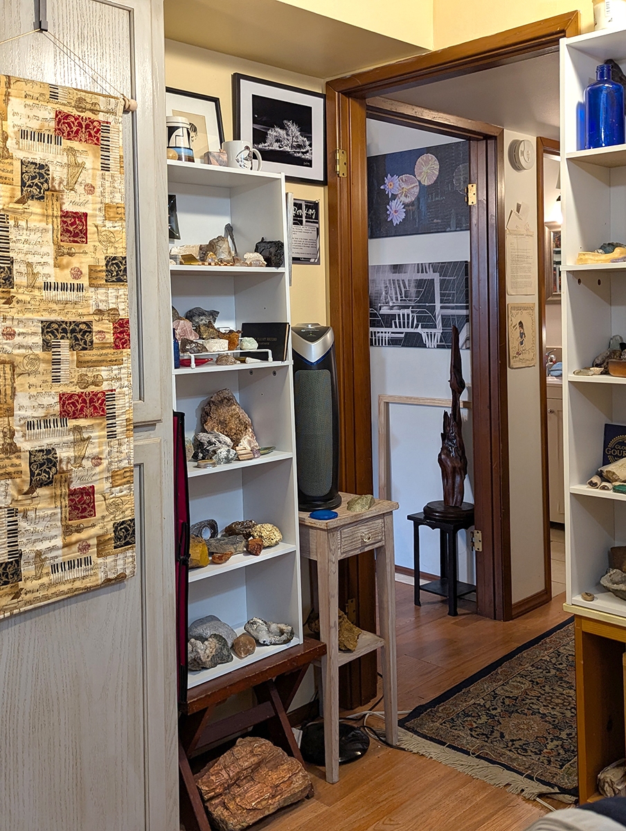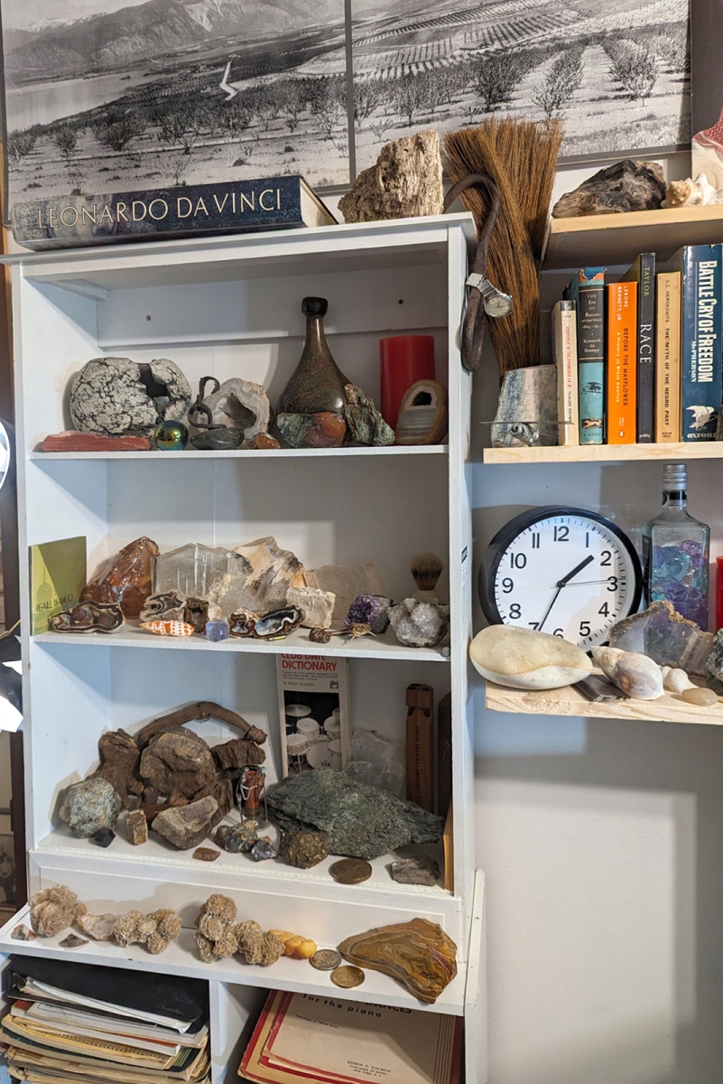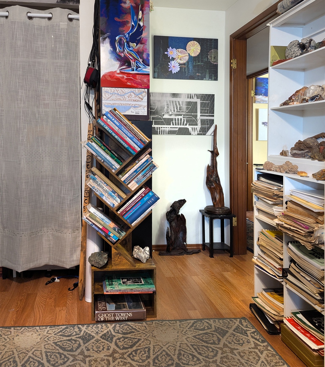 My place is a blending of a library, my art, a rock and mineral collection, and historical artifacts related to my journey. Click on thumbnails to see the entire image. Visitors are welcome by appointment and in small groups only.